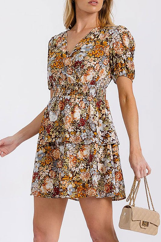 Floral Print V Neck Tiered Ruffle Mini Dress