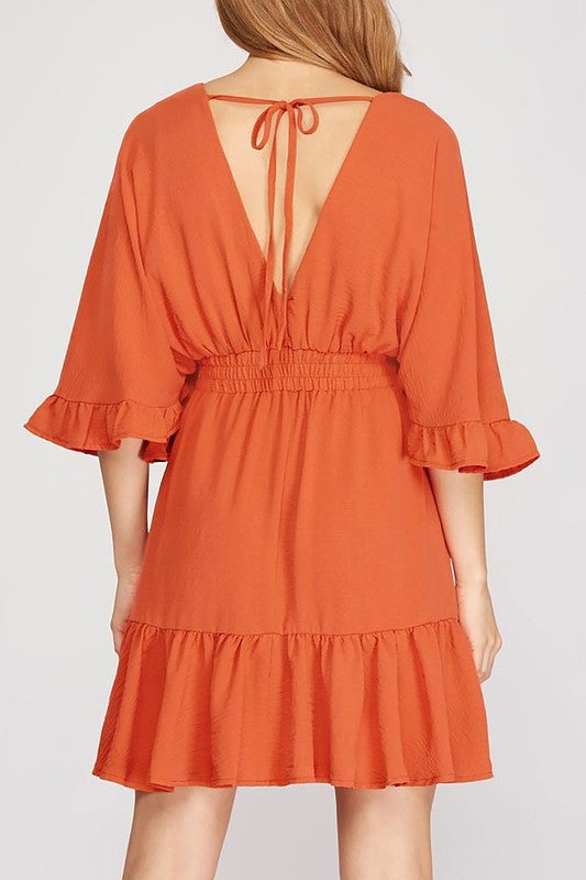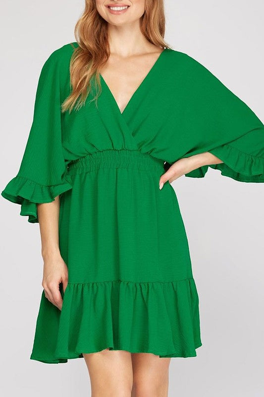 Ruffled Dolman Sleeves Elastic Waist Woven Dress