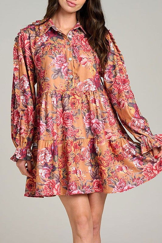 Floral Print Button Up Pockets Tiered Mini Dress