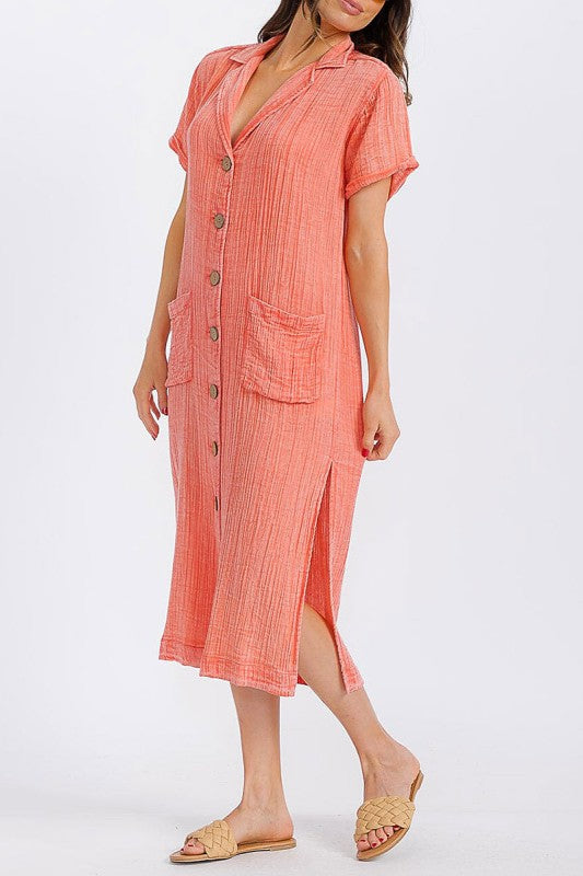 Short Sleeve Button Up Front Pockets Washed Dress